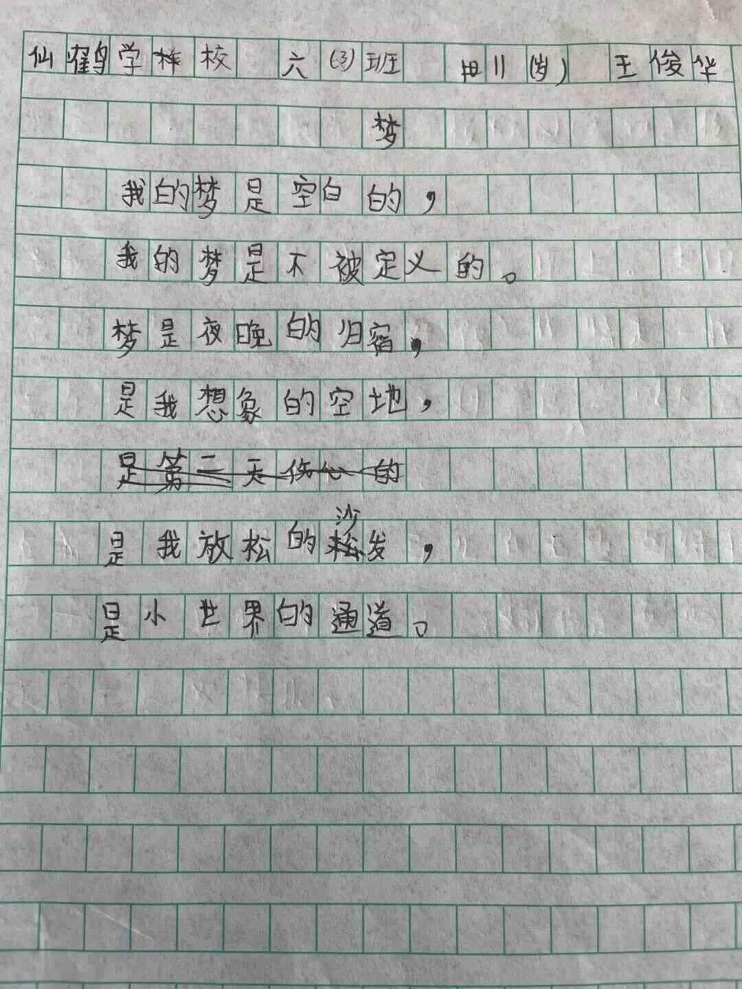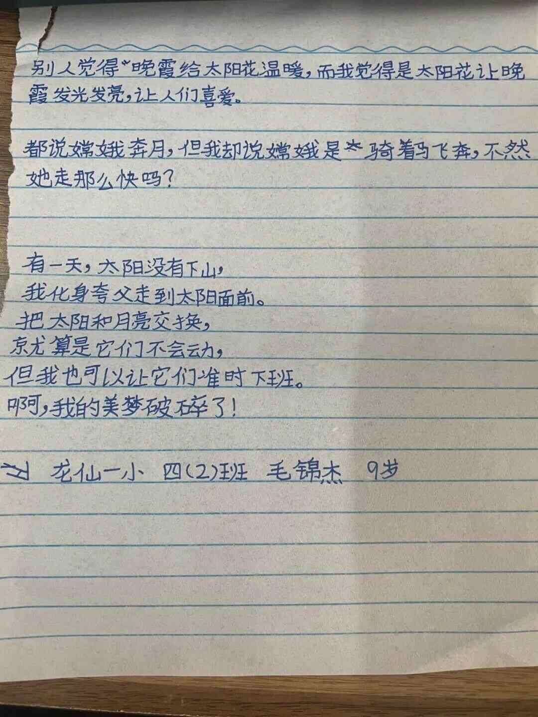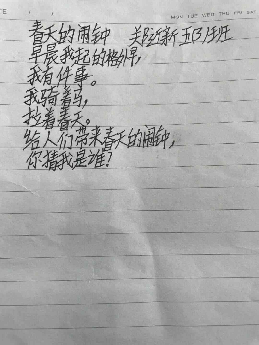 在最后的自由创作环节,同学们低头伏案,笔尖流淌出属于他们自己的诗意。小王老师穿行其间,耐心点评、轻声鼓励,并邀请写得精彩的同学上台朗读。有的孩子说:“我骑着马,拉着春天,给人们带来春天的闹钟。”有的孩子写道:“梦是夜晚的归宿,是我想象的空地。” “我化身夸父走到太阳面前,把太阳和月亮交换。”……同学们分享着自己奇思妙想,用稚嫩而真诚的语言,搭建起一个个缤纷多彩的想象世界。