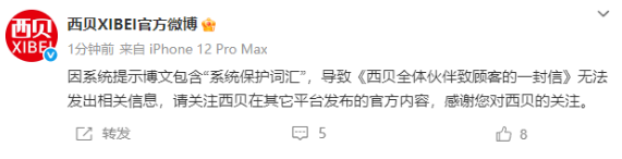 刚刚,西贝回应,否认删博:因系统提示博文包含“系统保护词汇”,导致《西贝全体伙伴致顾客的一封信》无法发出相关信息,请关注西贝在其他平台发布的官方内容,感谢您对西贝的关注。
