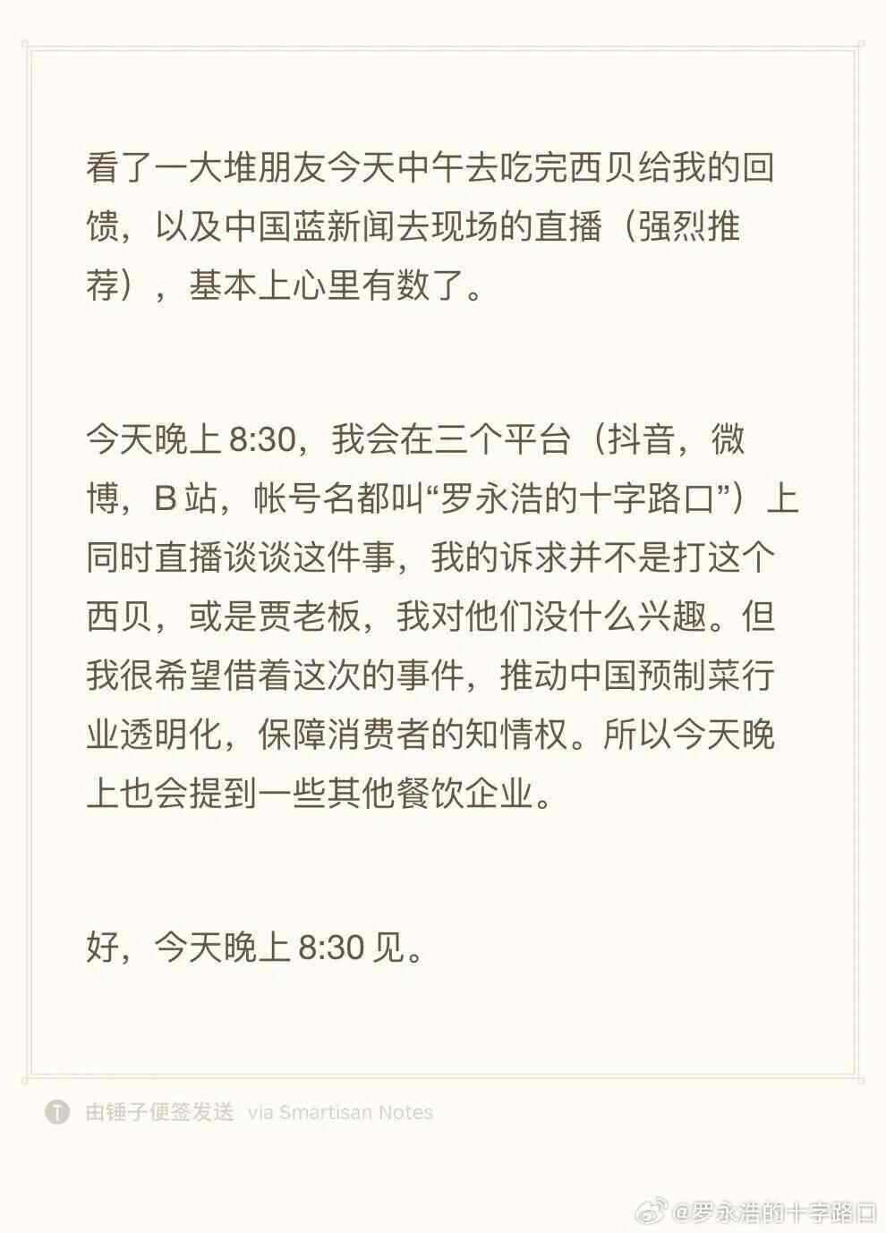 罗永浩称自己并不是要“打西贝”