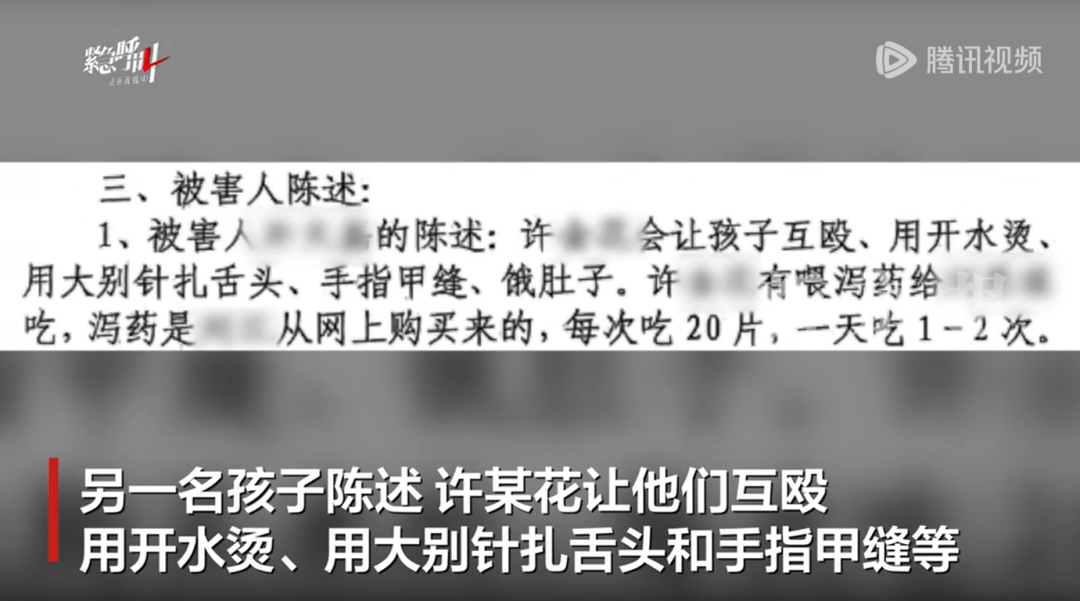 一审判决书显示,继母许某花还长期虐待收养的两个养子女,强迫吃屎喝扫把水,用针把手钉在墙上、用开水烫等。