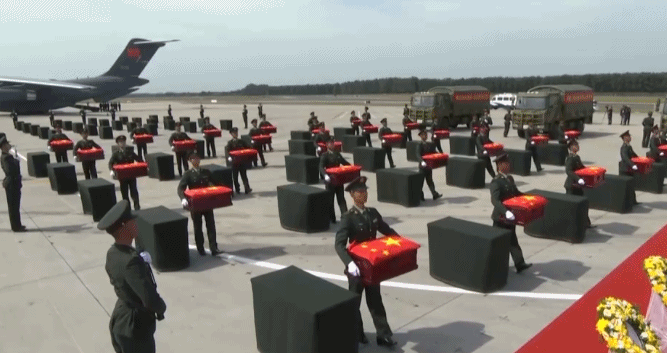 12日上午,韩方将志愿军烈士遗骸棺椁运送至仁川国际机场并移交给中方。