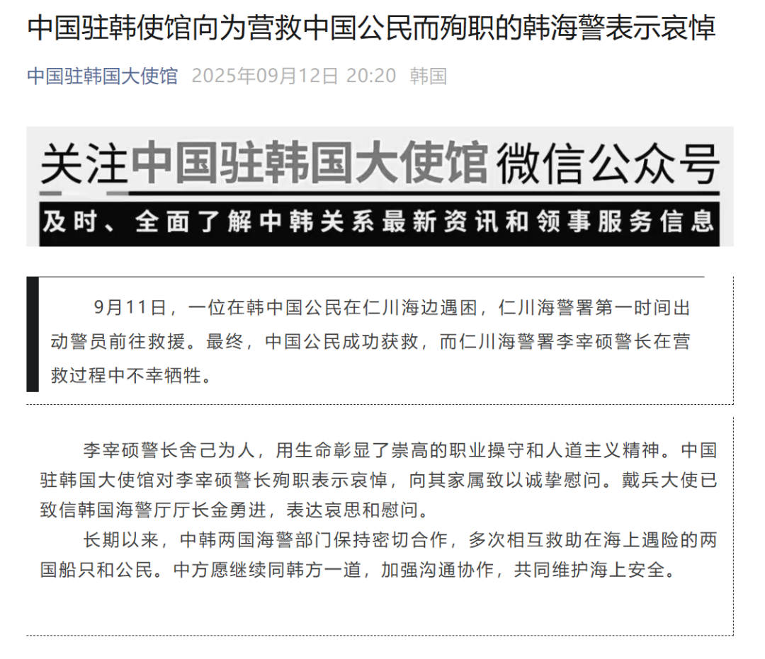 9月12日,据“中国驻韩国大使馆”官微消息,9月11日,一位在韩中国公民在仁川海边遇困,仁川海警署第一时间出动警员前往救援。最终,中国公民成功获救,而仁川海警署李宰硕警长在营救过程中不幸牺牲。