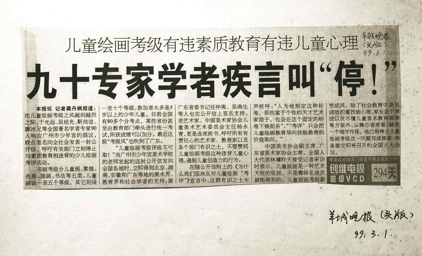 让这份呼吁突破行业圈层、引发全国关注的,正是《羊城晚报》1999年3月1日的头版报道。“当时这篇报道由羊城晚报记者龚丹枫采写,主标题特别醒目:九十专家学者疾言叫‘停!’”,关小蕾回忆起当时的情景,语气里仍难掩激动,“报道一出来,全国都有反响,有人支持我们的观点,也有人展开讨论,但不管怎样,大家终于开始关注‘儿童美术教育该如何尊重孩子天性’这个问题了”。