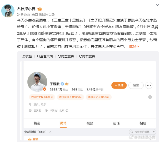 微博账号“名侦探小宴”发布,称于朦胧于9月11日凌晨被发现坠楼,现场有细节描述,包括时间线、地点、反锁房门及随身物品等。随后相关消息冲上热搜。