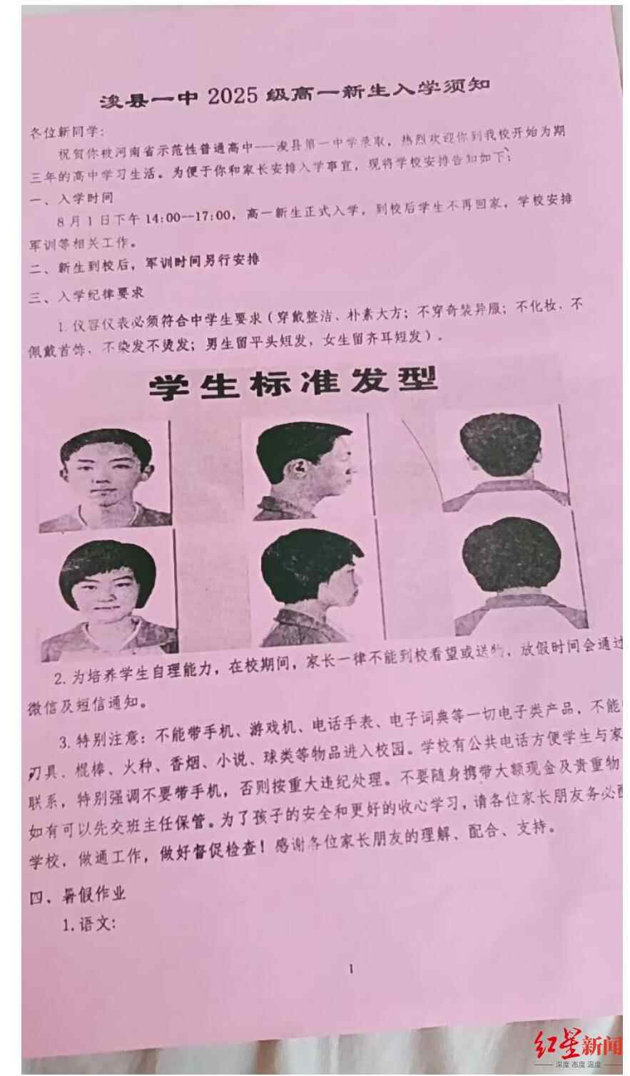 河南鹤壁市浚县第一中学8月发布的《2025级高一新生入学须知》中也提到,男生须留平头或短发,女生须留齐耳短发,并配有“学生标准发型”示意图供参考。