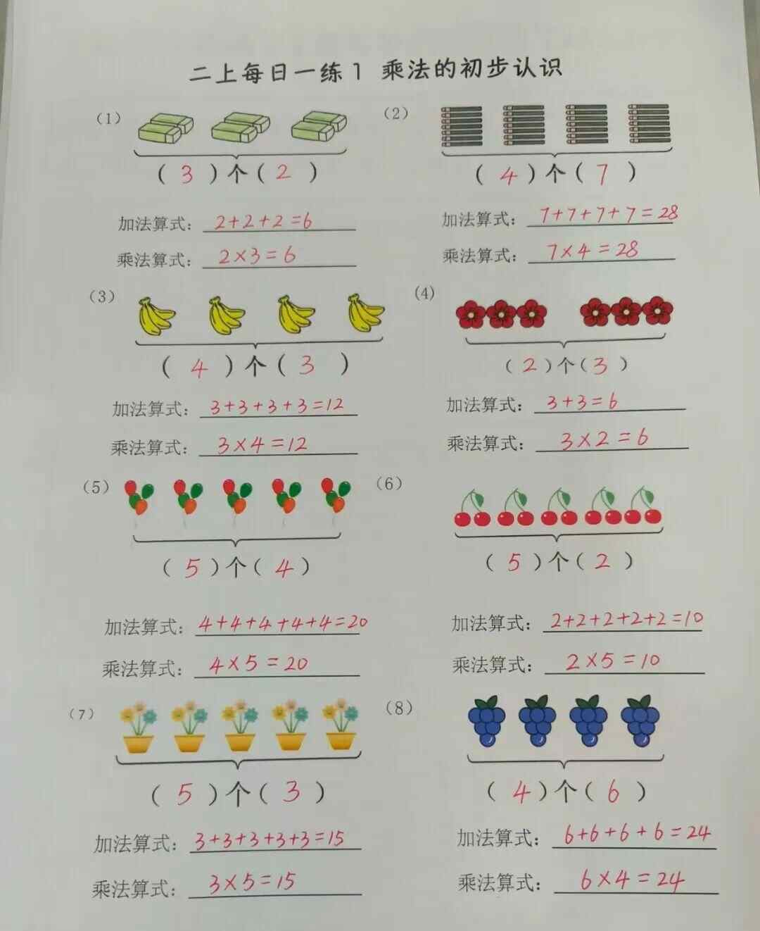 而2025年秋季学期开始,老师要求学生清晰掌握乘法算理,明确列式写法为每份数×份数=总数,即3个2相加的乘法列式为2×3,2个3相加的乘法列式为3×2,用这种方式帮助学生建立“量×份数”的认知结构,了解倍数关系。