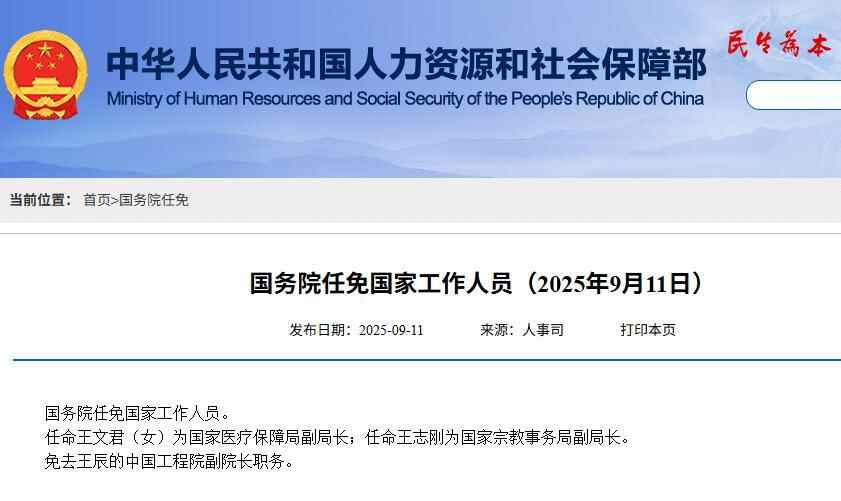 任命王文君(女)为国家医疗保障局副局长;任命王志刚为国家宗教事务局副局长。