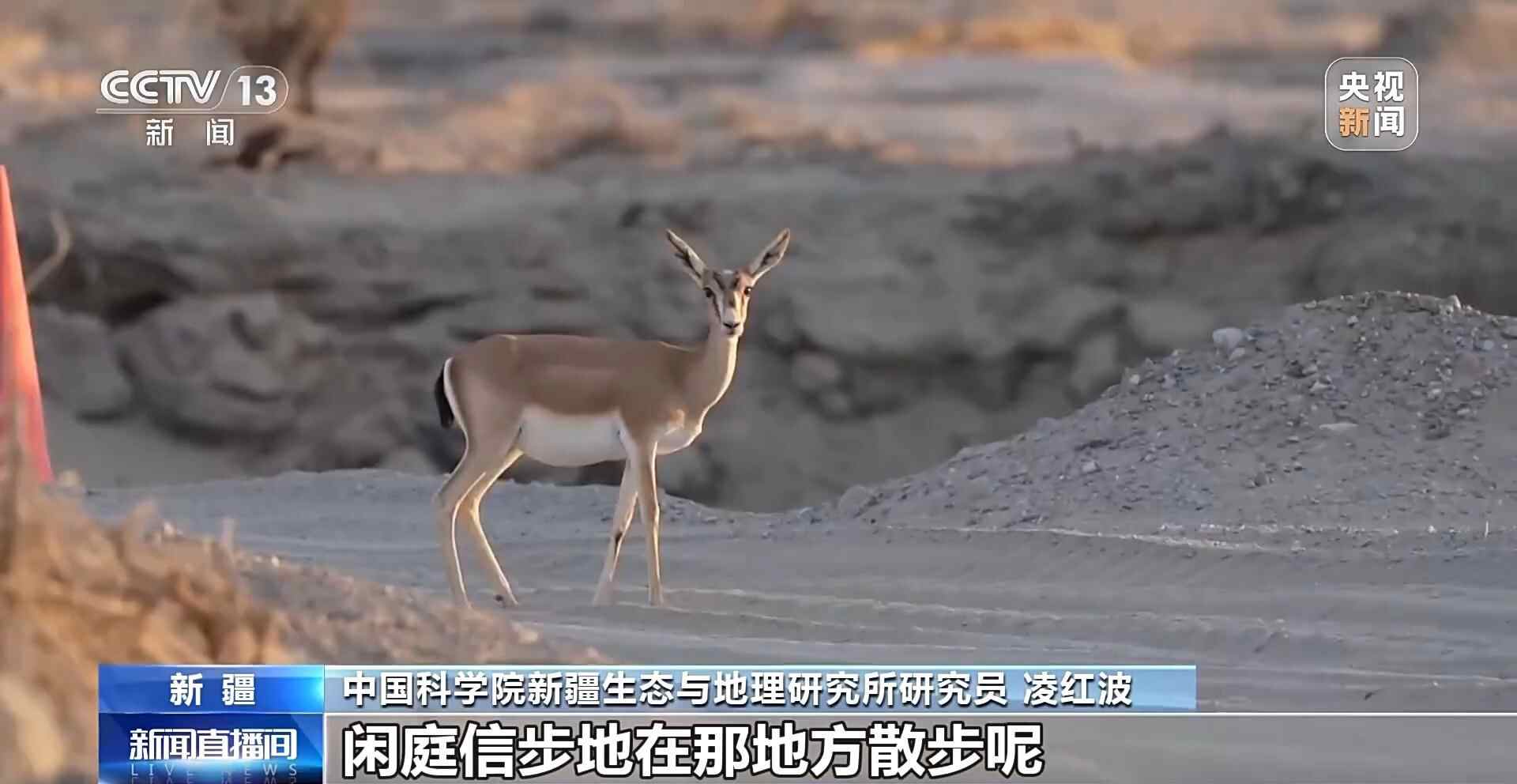 中国科学院新疆生态与地理研究所研究员 凌红波:黄羊不怕人了,闲庭信步地在那儿散步呢。这就是人与自然和谐相处。