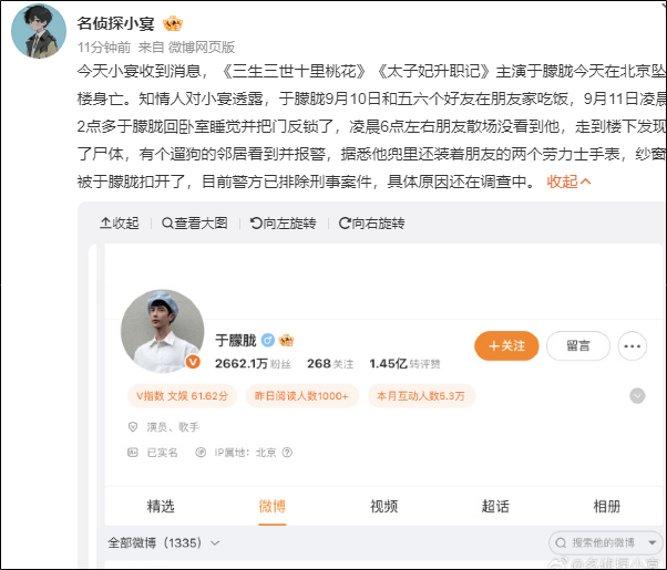 今天,演员于朦胧因“坠楼”传闻登上热搜,网友@名侦探小宴 爆料称其在北京朝阳区某小区坠楼。