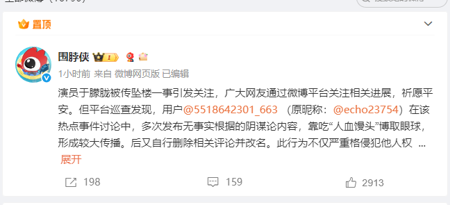 演员于朦胧被传坠楼一事引发关注,广大网友通过微博平台关注相关进展,祈愿平安。但平台巡查发现,用户@5518642301_663 (原昵称:@echo23754)在该热点事件讨论中,多次发布无事实根据的阴谋论内容,靠吃“人血馒头”博取眼球,形成较大传播。后又自行删除相关评论并改名。此行为不仅严重格侵犯他人权益,更扰乱了正常传播秩序。