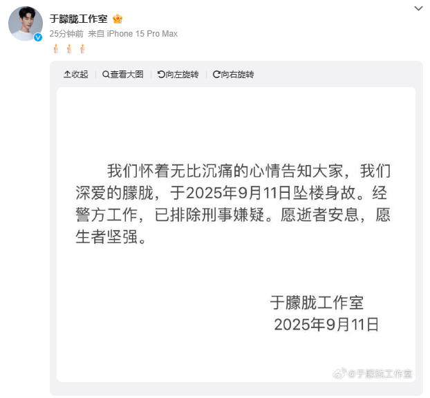 9月11日18时50分,@于朦胧工作室 发文:我们怀着无比沉痛的心情告知大家,我们深爱的朦胧,于2025年9月11日坠楼身故。经警方工作,已排除刑事嫌疑。愿逝者安息,愿生者坚强。
