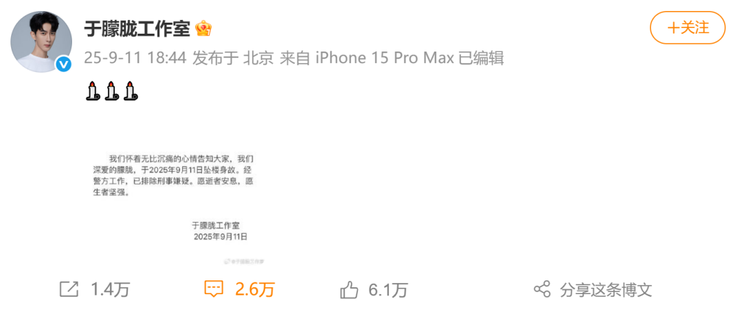 工作室证实:于朦胧坠楼身故,已排除刑事嫌疑