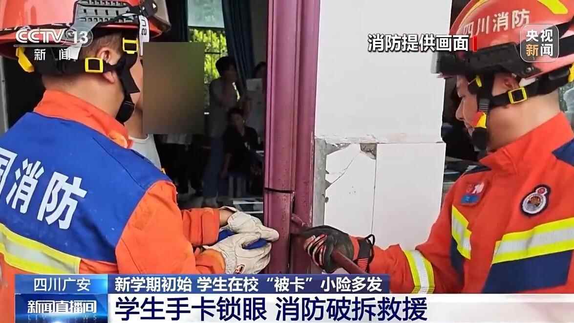 近日,在四川广安某中学,一名学生不慎将手指卡在教室防盗门的锁眼内无法取出。消防员到场后先后对学生手指被卡位置附近进行切割,最终学生被卡手指被成功取出。