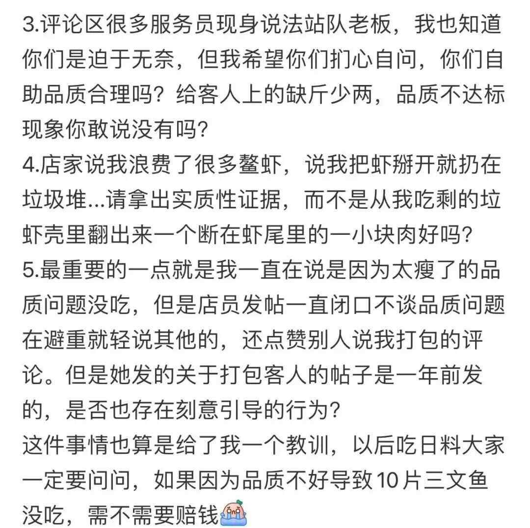 上述店员称:“我们提醒她时已经晚上9点了,但她还没有结束用餐,桌面上仍然摆放着大量菜品,出于好心,我们让她继续用餐,只要她吃完不浪费就行。结果十点半收桌时,我们看到她的桌面上有很多虾壳和蟹壳,壳下面盖着许多片完整无缺的三文鱼。对我们而言,这就是恶意浪费,并且将剩余食物藏匿,这本来就是不对的。”