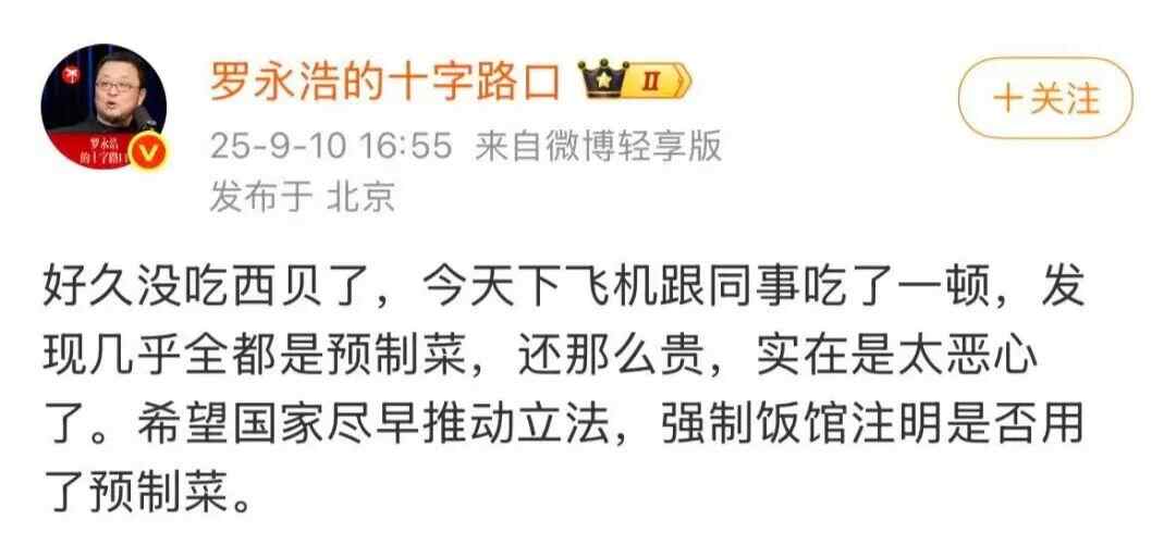 此前,罗永浩在社交媒体上吐槽西贝“几乎全都是预制菜,还那么贵”“希望国家尽早推动立法,强制饭馆注明是否用了预制菜”,一时间又把预制菜推上了舆论场的风口浪尖。
