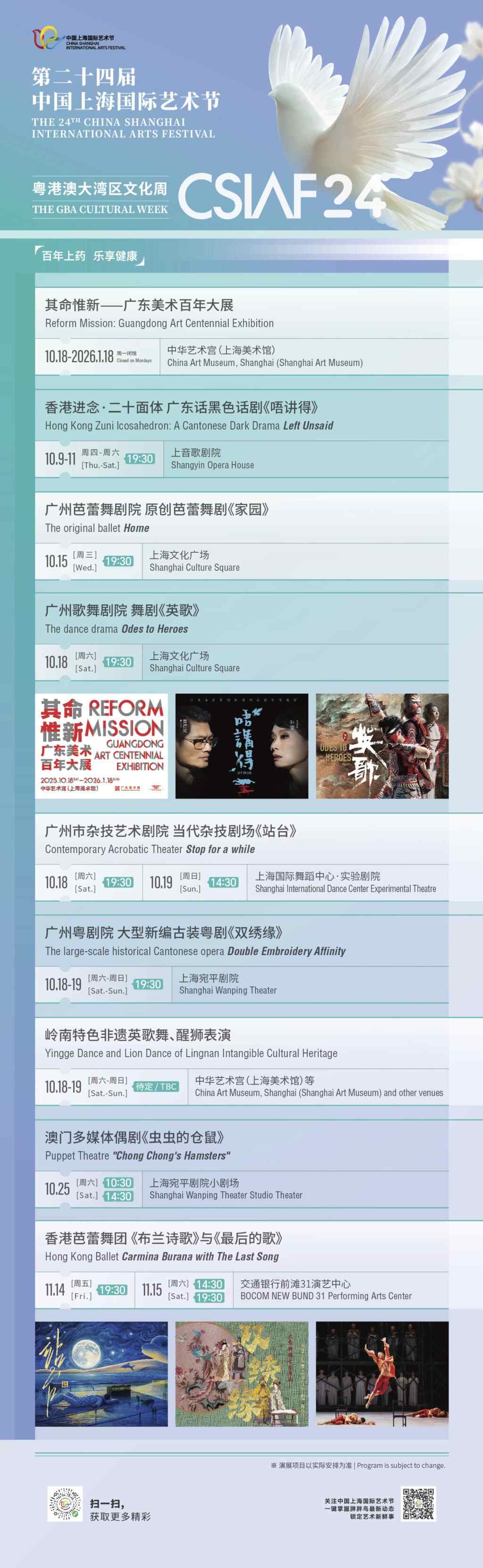 香港电影金像奖影后叶童和“梅花奖”双旦李嘉宜、吴非凡等名家荟萃,香港芭蕾舞团、广州粤剧院、广州歌舞剧院等名团齐聚,英歌、醒狮等岭南非遗文化和市民零距离互动……