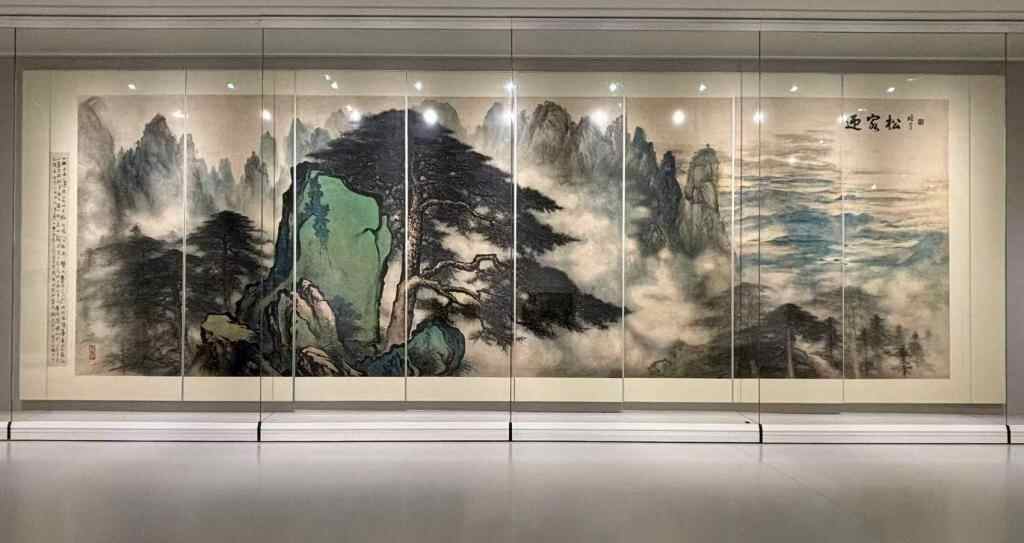 《迎客松》宽11.33米、高3.61米,是黎雄才1975年历时三月完成。画面中远景群峰耸立、云霭缭绕,前景松枝遒劲勃发、郁郁苍苍,展现出“黎家山水黎家松”的典型风格。