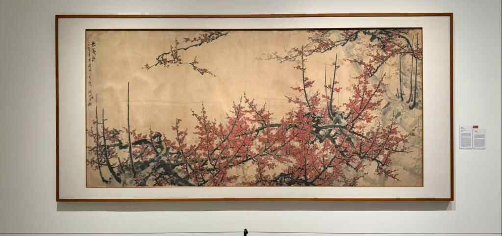 《报春图》宽3.7米、高1.73米,出自关山月1979年之手,被誉为其画梅艺术的巅峰之作。画中所用的朱砂颜料,来自关山月与傅抱石合作绘制《江山如此多娇》里的红太阳时余下的材料。