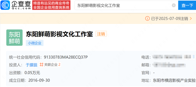 据企查查APP显示,于朦胧名下共关联两家公司,分别为上海起萌影视文化工作室和东阳鲜萌影视文化工作室,目前两家公司均已注销,其中东阳鲜萌影视文化工作室注销日期为今年7月9日。此外,上海起萌影视文化工作室已申请注册多条于朦胧商标,国际分类涉及啤酒饮料、颜料油漆等。