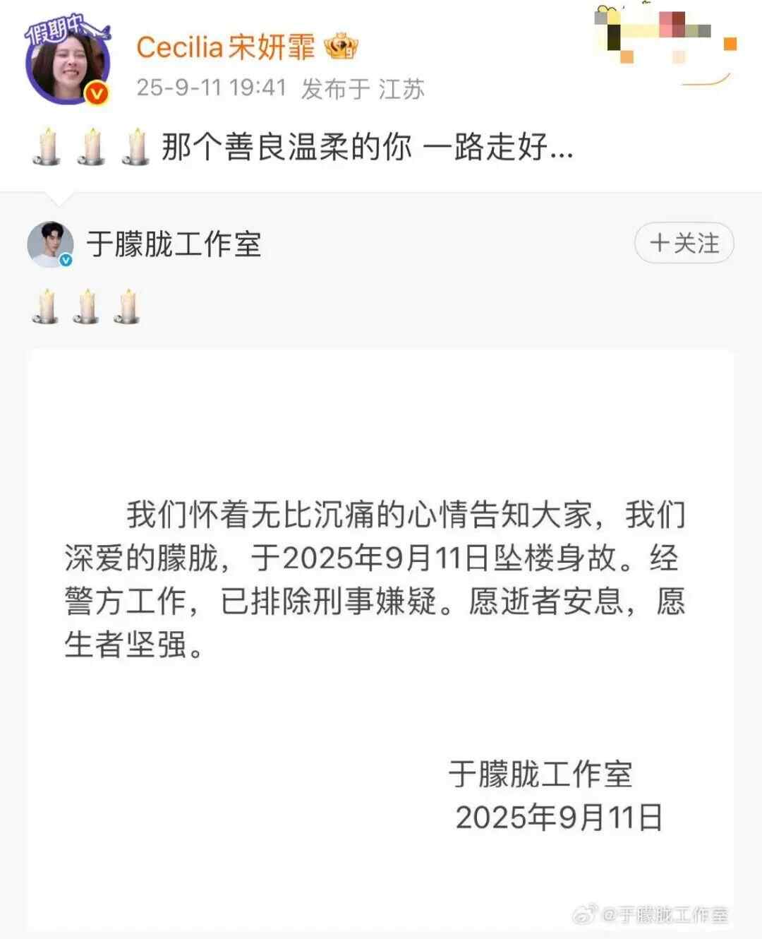 9月11日傍晚,于朦胧工作室发文称:“我们深爱的朦胧,于2025年9月11日坠楼身故。经警方工作,已排除刑事嫌疑。愿逝者安息,愿生者坚强。”