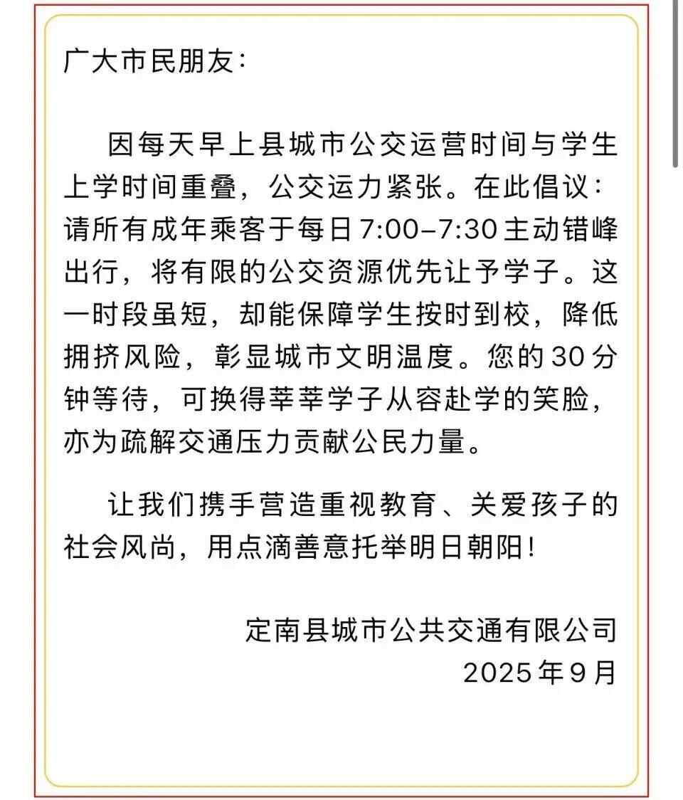 9月11日,定南县交通运输局表示,已在当地官方账号发出倡议,号召成年乘客错峰出行,让出每日7:00-7:30时段,将有限的公交资源优先让予学子。