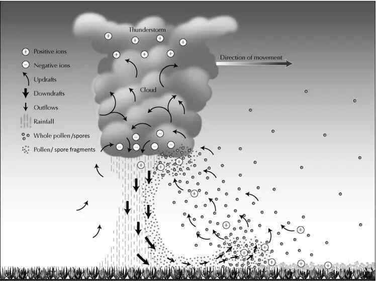 ·雷暴发生前,气温骤降、大风呼啸,会把地面的花粉、霉菌颗粒“卷”到云层里。