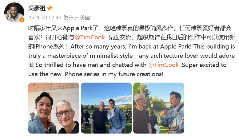 吴彦祖晒出3张和库克的合照写道:“时隔多年又来Apple Park了!这幢建筑真的是极简风杰作,任何建筑爱好者都会喜欢!很开心能与@TimCook见面交流,超级期待在我日后的创作中可以使用新的iPhone系列!”