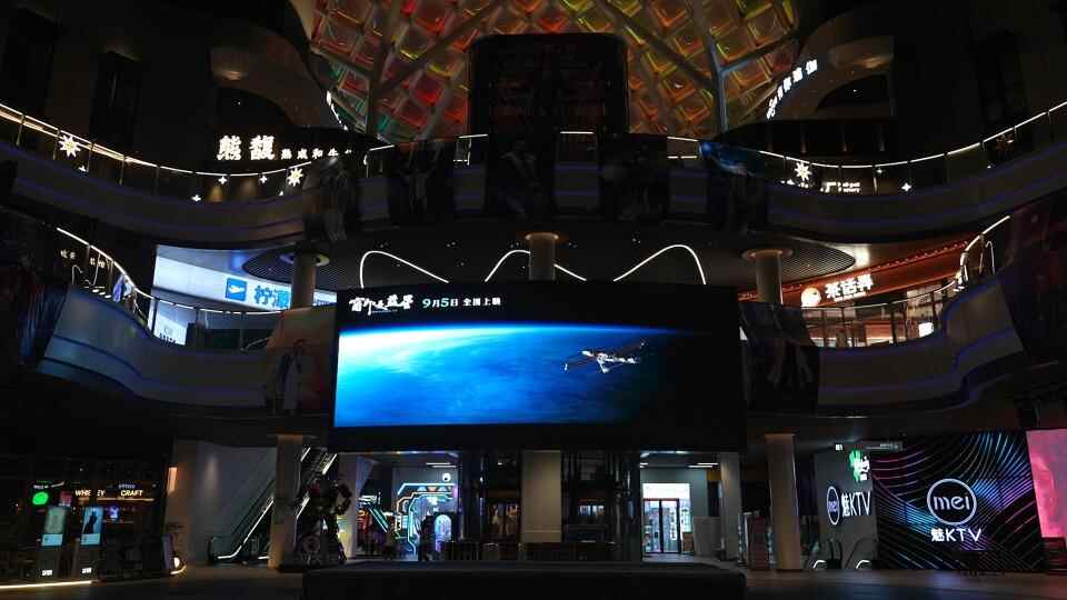 在梅州,横店电影城前的大屏上循环播放《窗外是蓝星》预告片,邀约观众开启“太空之旅”。