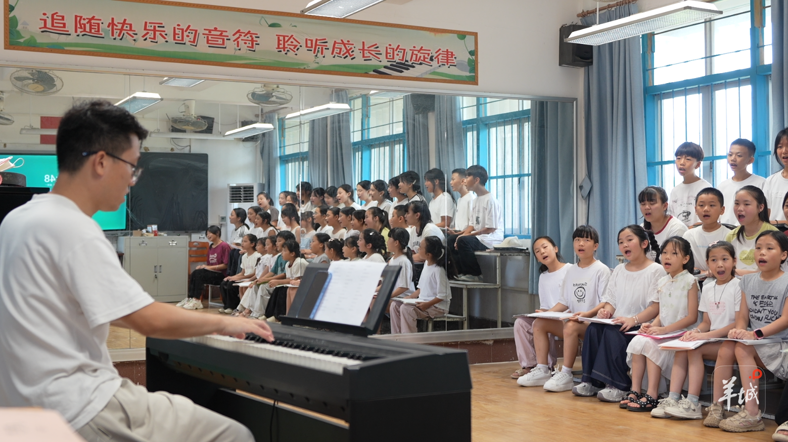 就这样,年轻的郭湧腾开始用最质朴的方式教学。他拿着老式录音机播放旋律,一句一句地带着孩子们跟唱。渐渐地,从那间简陋的音乐教室里,飘出的歌声成了校园里最动听的音符。