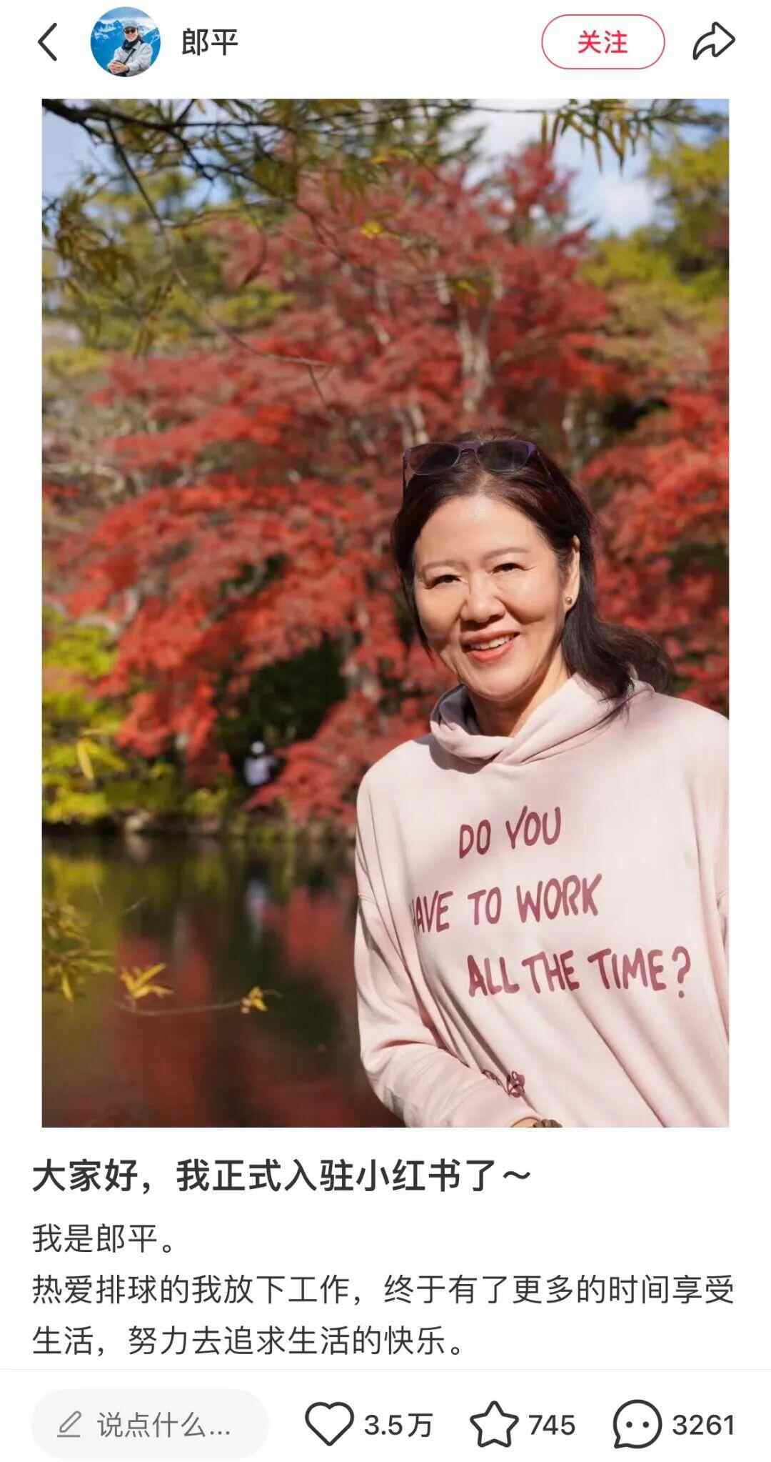 9月9日,郎平宣布正式入驻小红书。她在配文中亲切写道:“热爱排球的我放下工作,终于有了更多的时间享受生活,努力去追求生活的快乐。为了学习生活的小窍门,我常在小红书‘潜水’。今天正式浮出水面,欢迎大家来我家做客,多多分享你们的生活经验,当然如果你们想跟我学打排球,可以评论区举个手噢~”