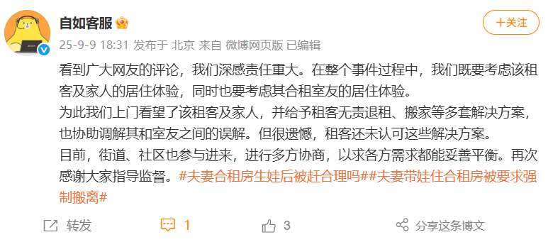 9月9日,自如客服官微发文回应称已经上门看望该租客及家人,并给予租客无责退租、搬家等多套解决方案,也协助调解其和室友之间的误解,但租客还未认可这些解决方案,正进行多方协商。