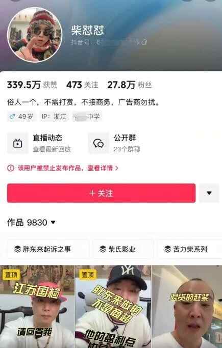 5月3日,抖音将柴怼怼的账号封禁,限制其账号投稿权限一个月,紧接着,其账号又被禁止关注。如今,在抖音已搜查不到“柴怼怼”的账号。