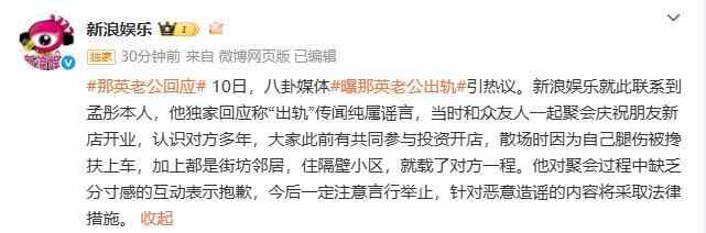 据新浪娱乐报道,已联系到孟桐(那英老公)本人,他回应称“出轨”传闻纯属谣言,当时是和众友人聚会,散场时因为自己腿伤被搀扶上车,加上都是街坊邻居,住隔壁小区,就载了对方一程。他对聚会过程中缺乏分寸感的互动表示抱歉,今后一定注意言行举止,针对恶意造谣的内容将采取法律措施。