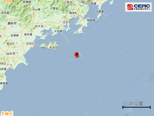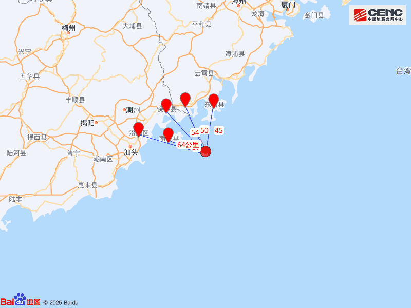 周边县城:震中距南澳县37公里、距福建东山县45公里、距福建诏安县50公里、距饶平县54公里、距澄海区64公里、距汕头市70公里。