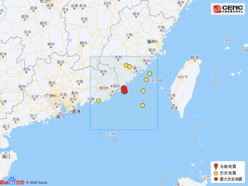 历史地震:根据中国地震台网速报目录,震中周边200公里内近5年来发生3级以上地震共10次,最大地震是2023年10月23日在广东汕头市南澳县海域发生的5.0级地震(距离本次震中4公里),历史地震分布如图。