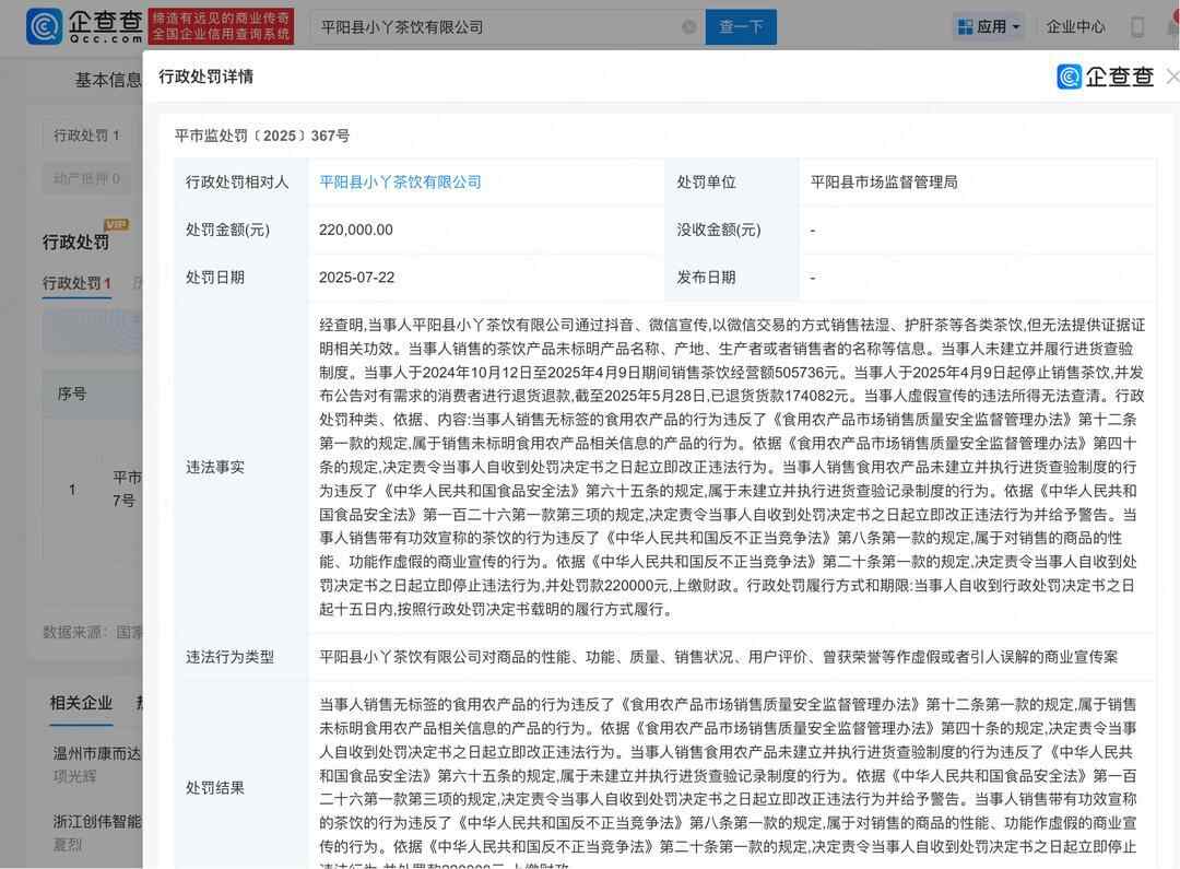 7月22日,柴向前妻子肖某为法人的平阳县小丫茶饮有限公司,因虚假宣传祛湿护肝等功效、销售无标签产品及未建立进货查验制度,被平阳县市场监督管理局责令改正违法行为、警告、停止虚假宣传行为,并罚款22万元。