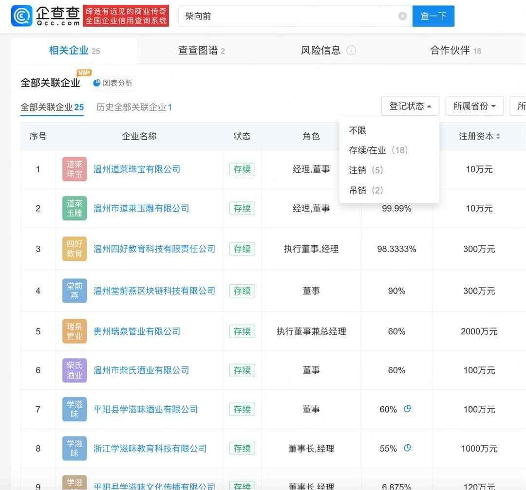 据企查查信息显示,柴向前(柴怼怼)名下关联超20家企业,其中7家已注销或被吊销,包括温州市柴氏酒业有限公司、武汉市柴氏珠宝有限公司等。