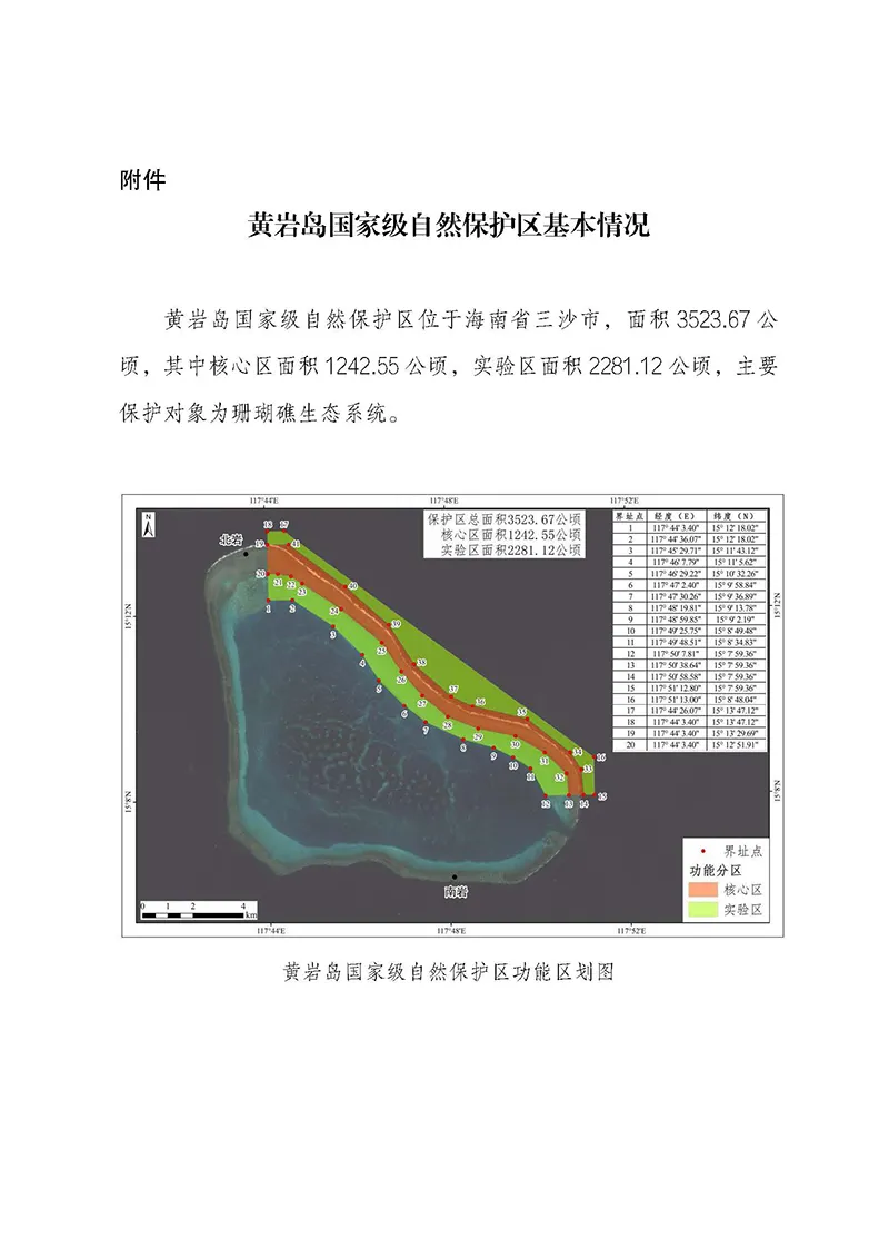 国务院已批准新建黄岩岛国家级自然保护区。根据《中华人民共和国自然保护区条例》有关规定,现将黄岩岛国家级自然保护区的面积、范围及功能区划予以公布。