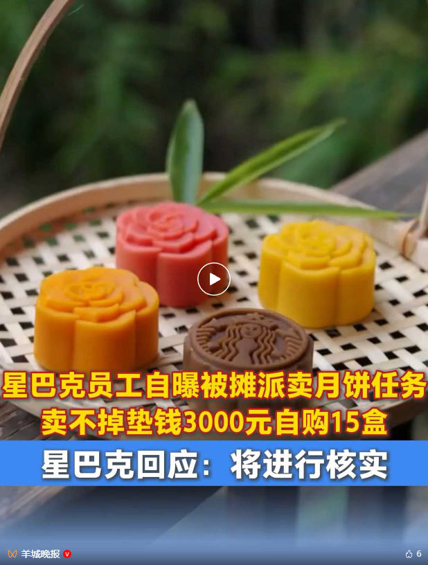 近日,一名IP属地为湖南的网友发帖称,作为星巴克兼职员工,因门店中秋月饼销售任务,“被逼着垫了15盒”,金额近3000元,导致生活费紧张。