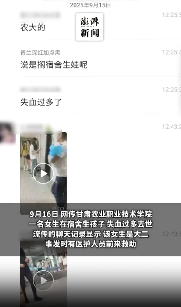 9月16日,网络流传甘肃农业职业技术学院一名大二女生于9月12日在宿舍内分娩的消息。现场视频显示,有人被担架抬出,疑似一名婴儿也被抱走。网络聊天记录显示,事发时有医护人员前来救助。一时间,“女生因失血过多不幸去世”的说法在网络上迅速传播,引发了广泛关注与热议。