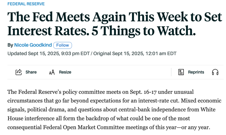 美联储的年度八次会议,每一次都牵动人心。例行节奏下,每一次投票、每一句声明都暗藏玄机。而眼下这次9月会议,由于既是政策拐点,又处于政治风暴,更因为将释放对未来两年利率走向的信号,注定要被置于放大镜下审视。