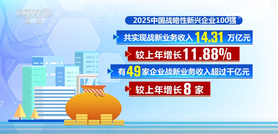 此次同步发布的中国企业500强榜单还包括战略性新兴产业100强等一系列专项榜单。2025中国战略性新兴企业100强,共实现战新业务收入14.31万亿元,较上年增长11.88%。有49家企业战新业务收入超过千亿元,较上年增长8家。