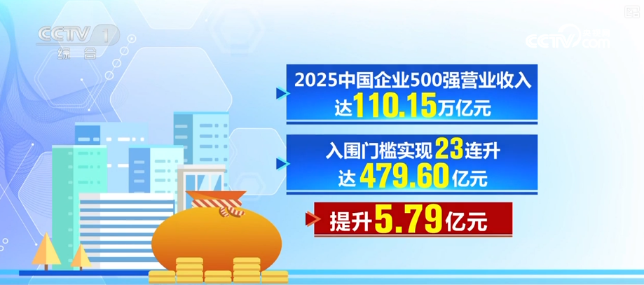 2025中国企业500强营业收入达110.15万亿元,入围门槛实现23连升,达479.60亿元,提升5.79亿元;实现归属母公司所有者净利润总额4.71万亿元,增长4.39%。