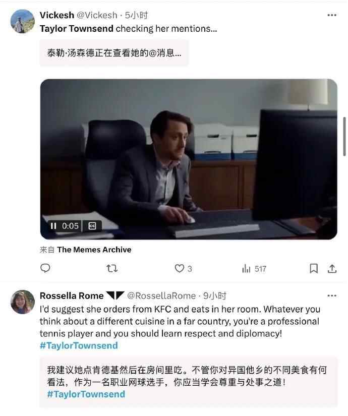 9月16日,美国网球选手泰勒·汤森德在深圳参加2025年比利·简·金杯总决赛期间,于个人社交平台连发多条视频,对赛事酒店自助餐的中国菜进行嘲讽式点评。