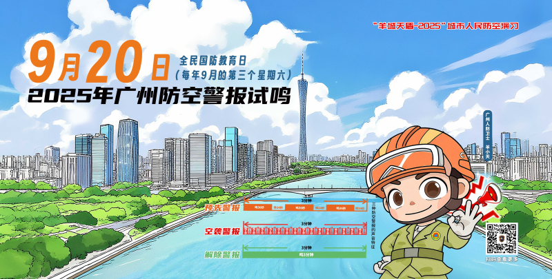 记者9月17日从广州市有关部门获悉,经广州市人民政府批准,广州市将于9月20日(全民国防教育日)上午举行全市防空警报试鸣暨“羊城天盾-2025”城市人民防空演习。