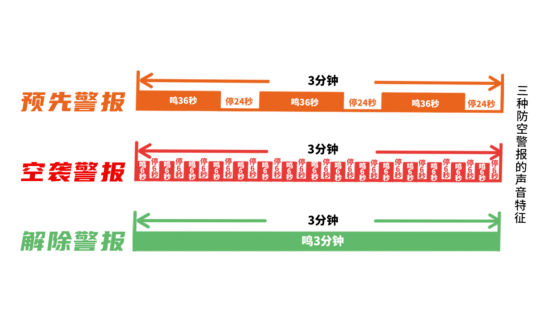 防空警报信号规定为:预先警报鸣36秒、停24秒,反复3遍,时间3分钟;空袭警报鸣6秒,停6秒,反复15遍,时间3分钟;解除警报连续鸣放3分钟。