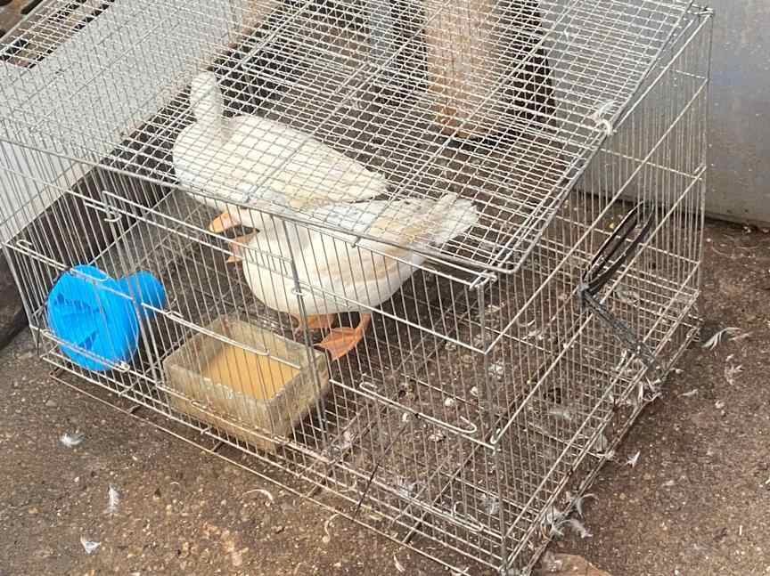 在“趾蹼”爬宠店目前仅存两只柯尔鸭待售,被放在店外的铁笼子里无人问津,笼子里散落着羽毛。宠物狗则在店内吹着空调。还是顶流的柯尔鸭也享受过 “优厚” 待遇,被单独陈列于丝绒垫上。