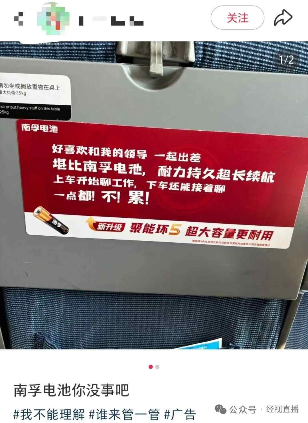 近日,一则出现在高铁座椅背后小桌板上的南孚电池广告语引发关注,内容为:“好喜欢和我的领导一起出差,堪比南孚电池,耐力持久超长续航,上车开始聊工作,下车还能接着聊,一点都!不!累!”