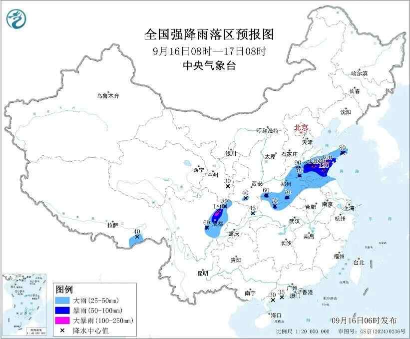 中央气象台9月16日06时发布暴雨黄色预警:预计,9月16日08时至17日08时,四川盆地中西部、甘肃南部、河南中东部、山东中南部以及苏皖北部等地部分地区有大到暴雨,其中,山东中南部、四川盆地北部等地部分地区有大暴雨(100至180毫米)。