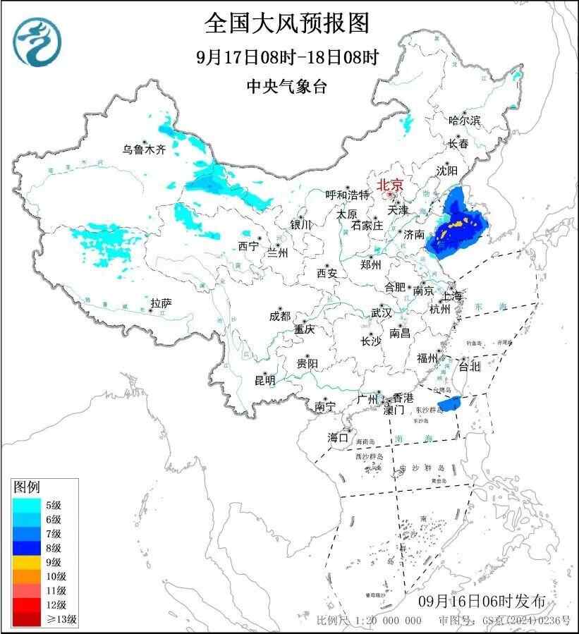 9月17日08时至18日08时,新疆东部、甘肃河西、青海北部、西藏北部等地部分地区有5级、阵风6级的大风,其中,甘肃河西等地局地风力可达7级、阵风8级;黄海大部海域将有7至8级、阵风9级的大风,其中黄海中部的部分海域风力可达9级、阵风10级。